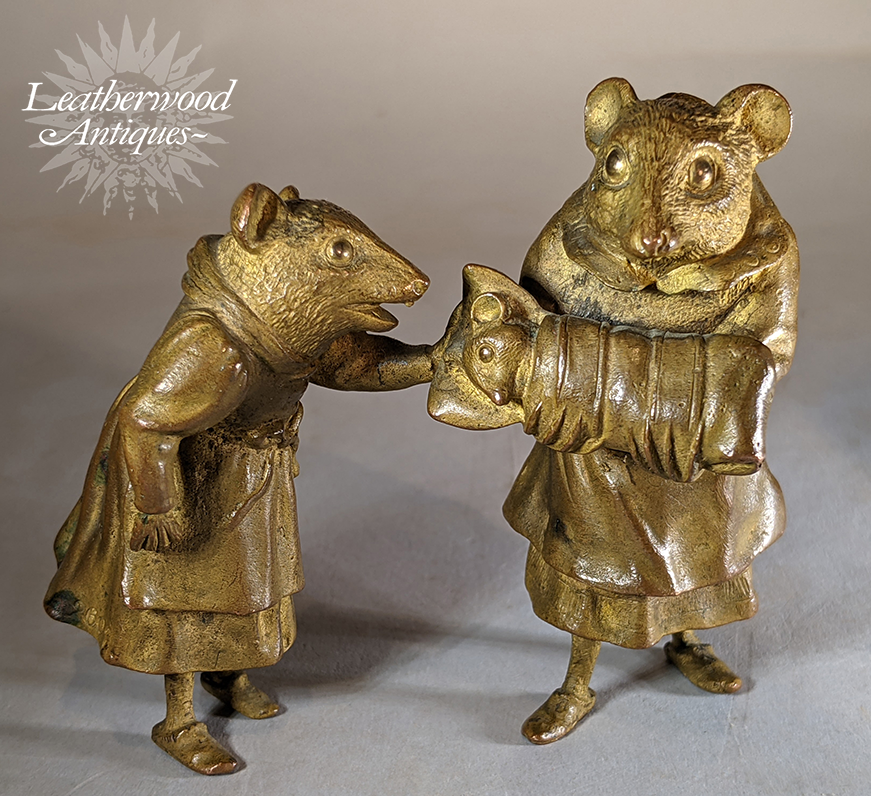 Unusual whimsical gilded & signed in several places Vienna Bronze composition of mice family scene (mother, baby, and daughter). c. 1900.