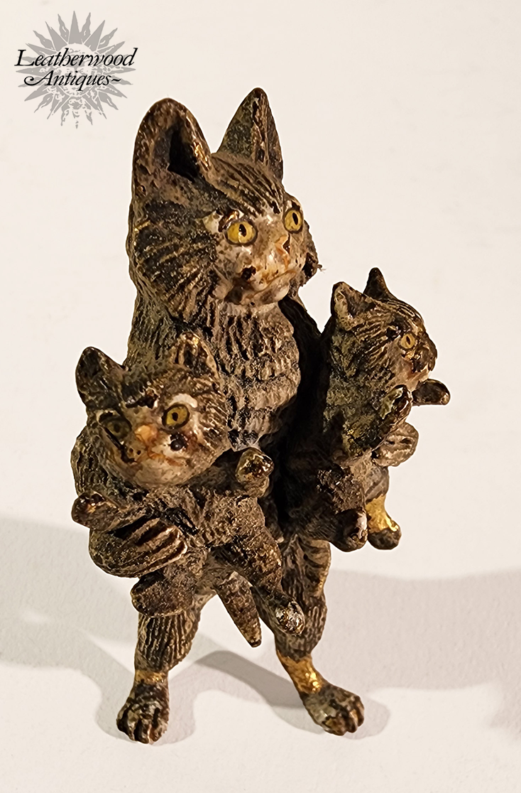 Cold-painted Vienna Bronze cat holding a kitten in each arm. Great paint & expression. c.1900.