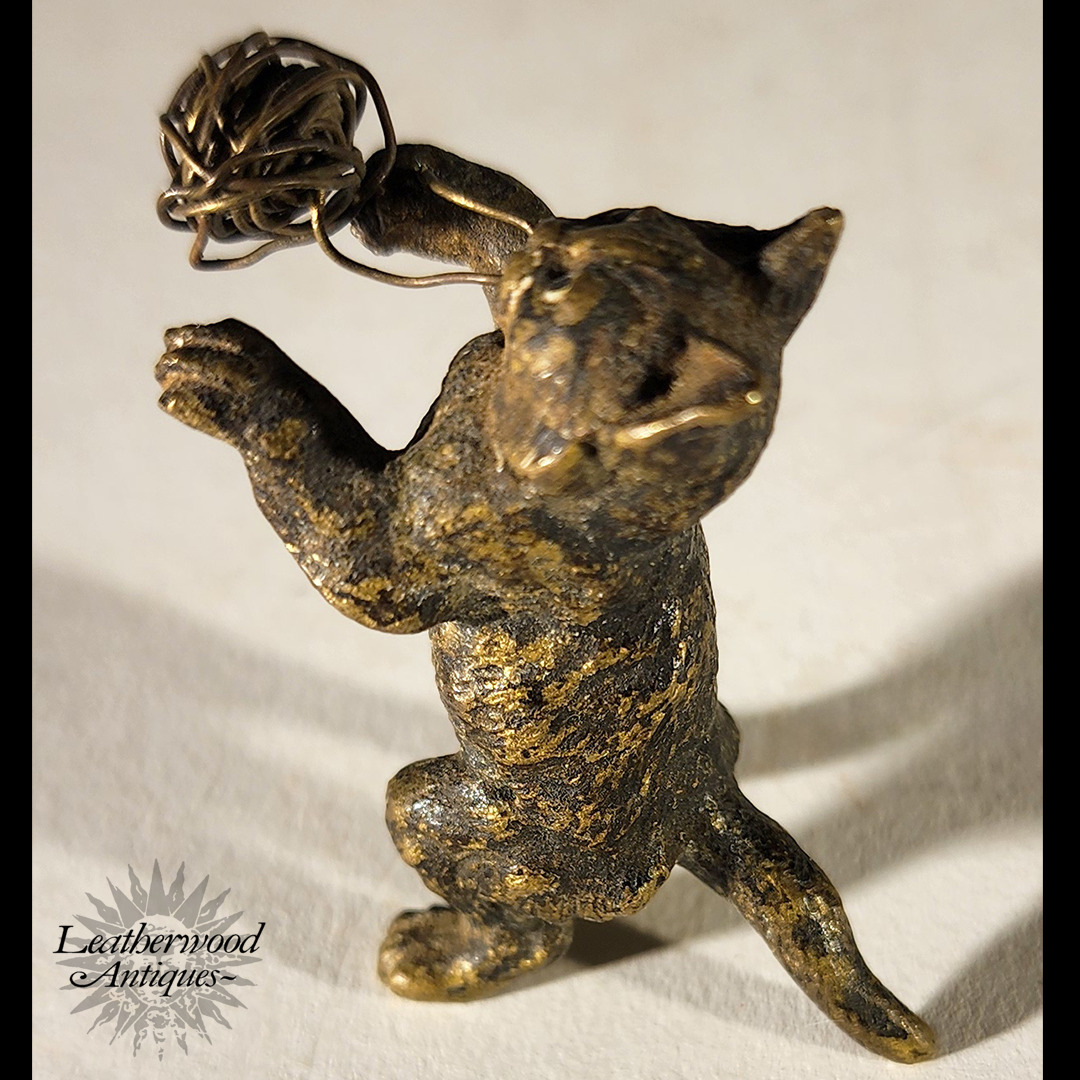 Vienna Bronze cat playing with a ball of string. The cat with a cute Victorian cat face and standing on its hind legs. c. 1890.